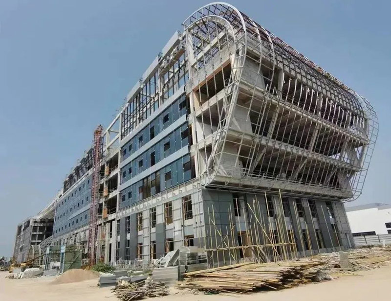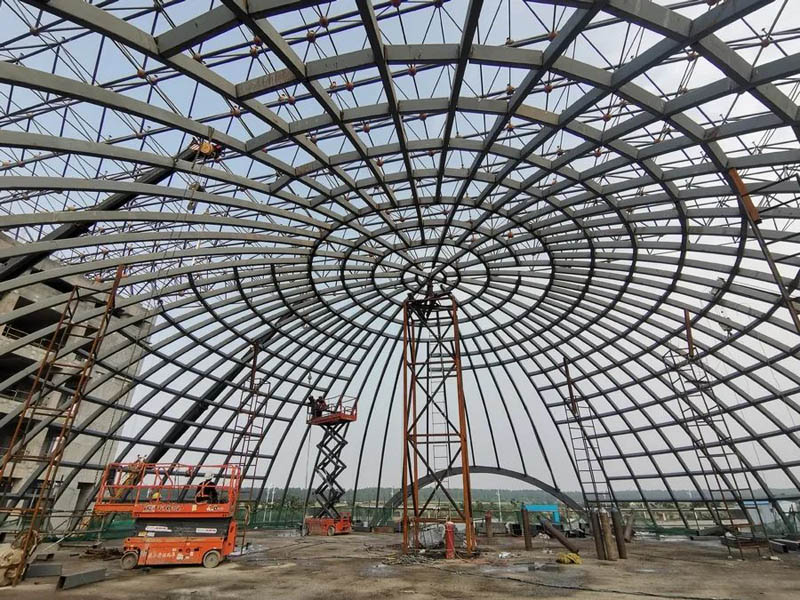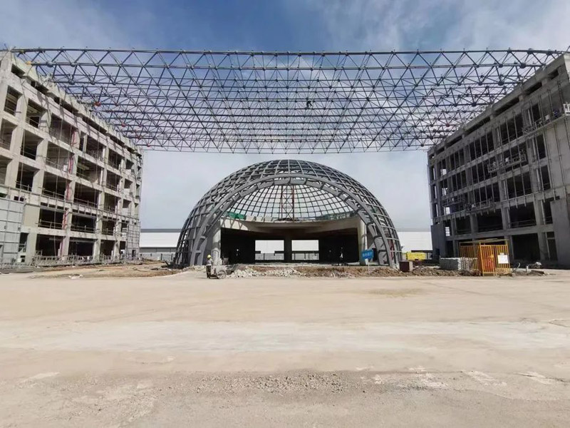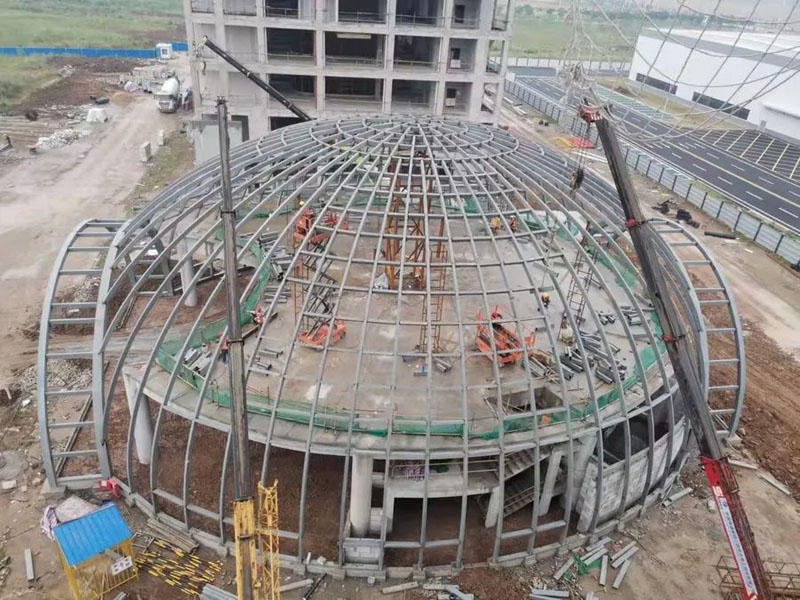 吉利飛行汽車項目汽車展廳鋼結構工程,主體是直徑32米的橢圓形空間桁架結構,本工程加工工藝復雜,構件數(shù)量多且雜,車間及現(xiàn)場焊接工作大,主構件對接焊接均要求一級焊縫,施工期間兩臺全站儀同時不同角度測量,配合臨時支撐架現(xiàn)場有序、施工,整體工期45天。